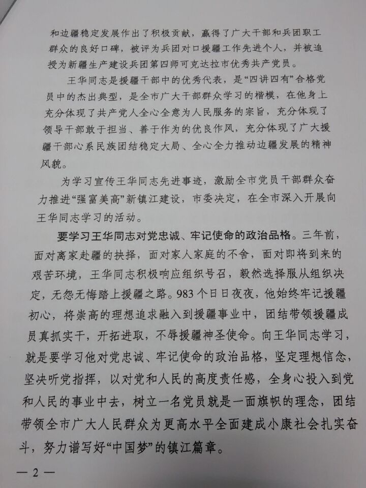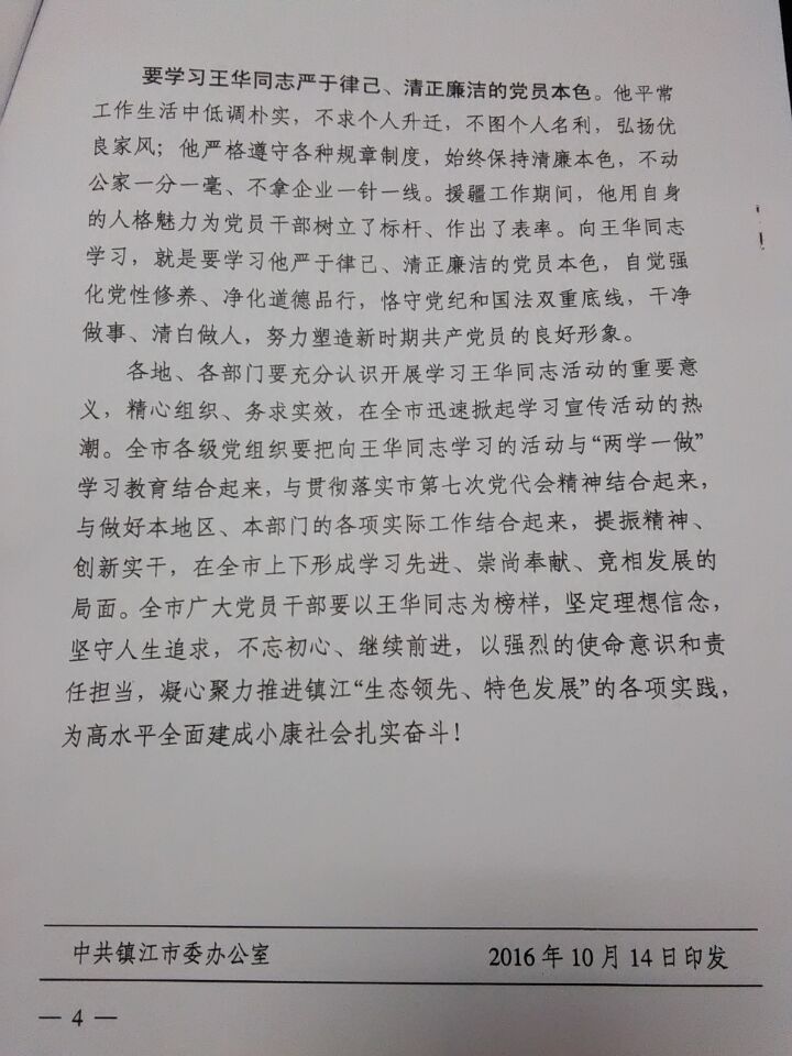中共镇江市委关于在全市开展向王华同志学习的决定(镇发【2016】45号)