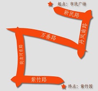 市民广场→新民路(步行约15分钟)→丹凤南路(步行约10分钟)→万善路(步行约20分钟)→简渎河东路(步行约15分钟)→紫竹路(步行约15分钟)→紫竹园(总长:约6公里)