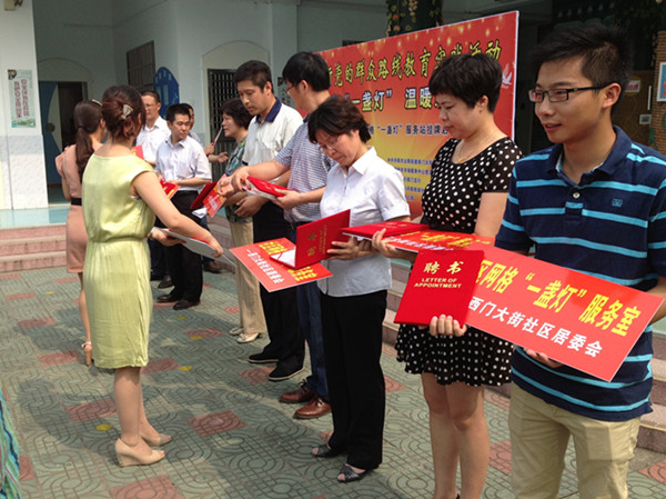揭牌仪式上,西门大街社区党总支书记李晨同志就社区网格“一盏灯”服务站具体活动向大家作简要介绍。贡晨峰与杨祥大两位同志为服务站揭牌,到场领导向社区网格“一盏灯”联络员发放聘书。云阳镇街道党工委副书记虞淀芳同志发言致辞,对西门大街党建工作提出新要求。