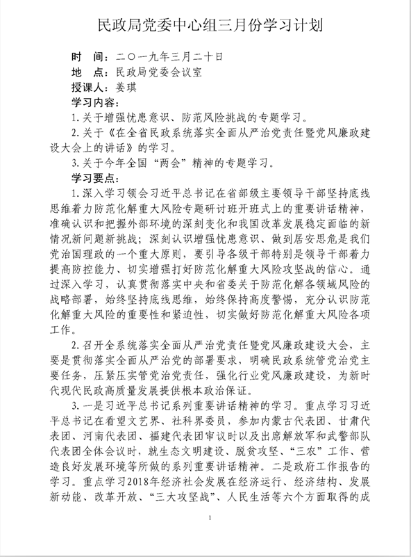 2019年民政局党委中心组三月份集体学习并交流研讨