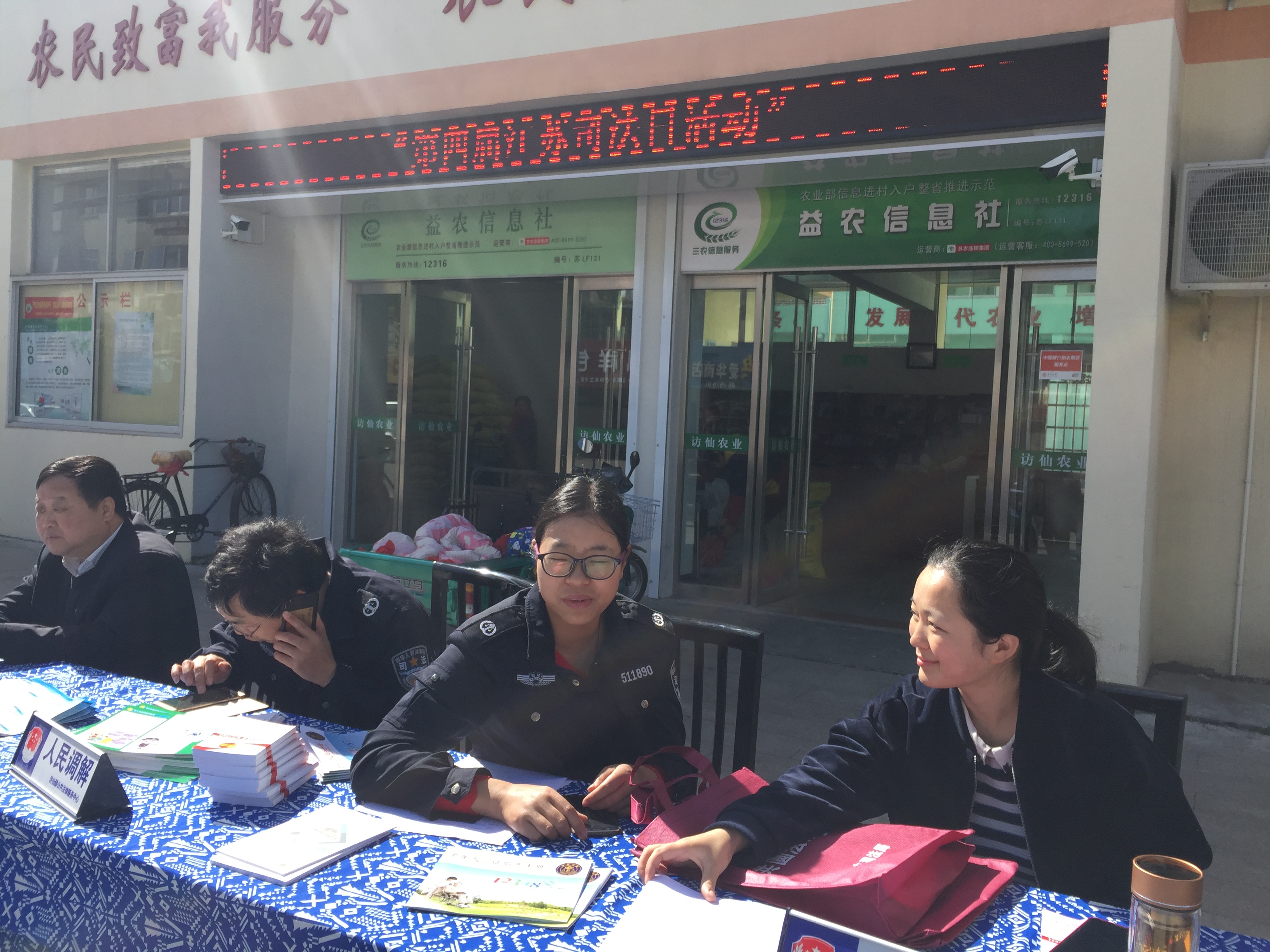 在宣传现场,司法所利用农服中心电子屏幕,打出“第四届江苏司法日活动”、“12348江苏法网连万家”、“德法涵养文明,共建绿色生活”等标语。改变了原有的条幅海报模式,更加节能环保。现场除了派发法律宣传手册,更有专业律师坐镇,为群众耐心提供法律咨询公益服务,司法所工作人员在现场努力派发宣传手册,过往路人纷纷驻足参与其中,群众反映热烈。