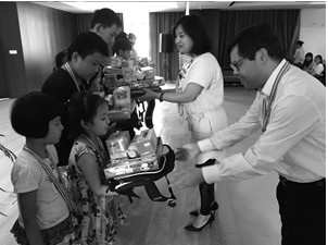 开学前夕,市民政局携手我市明翼义工社、江苏全真光学科技有限公司共同举办了一场关爱困境儿童的公益活动。活动不仅邀请了市儿童医院的医生志愿者为孩子们讲解基础卫生知识,还向每位孩子赠送了开学必备的文具大礼包,并为孩子们进行视力测试。图为26日下午,开发区全真光学公司内爱心涌动,延陵、吕城、访仙等镇的40余名困境儿童都收到了一份开学大礼包。
