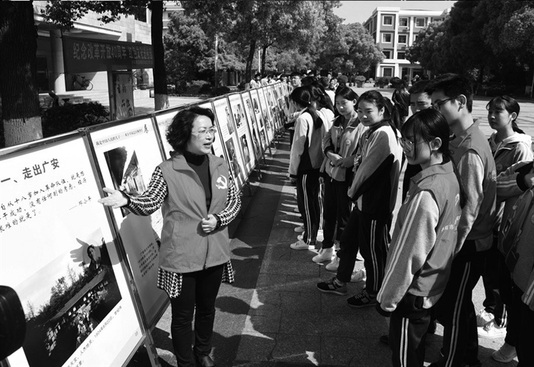 连日来,由市委宣传部、市总前委旧址纪念馆等单位举办“纪念改革开放40周年——邓小平同志经典图片展”进校园活动,精选了118张反映邓小平这位改革开放总设计师伟大而又平凡一生的经典图片。图为市第五中学学生在图片展现场聆听解说员讲解。