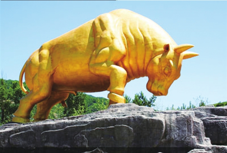第一天过去了,第二天过去了,到了第三天傍晚的时候,猛听得轰隆一声巨响,乱石山裂开了一个大口子,只见金光一闪,一条光灿灿的金牛跃出洞,那金牛扬起前蹄,将正要牵引他鼻子的那个农夫一脚踢到了半空,农夫惨叫了一声,摔死了。接着,金牛四蹄一腾,向天空飘然而去……
