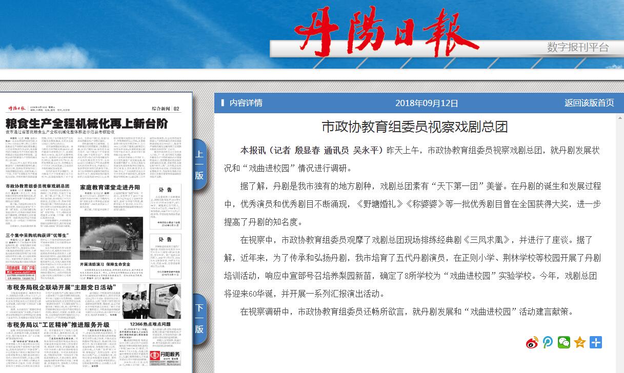 9月12日上午,市政协教育组委员视察戏剧总团,就丹剧发展状况和“戏曲进校园”情况进行调研。