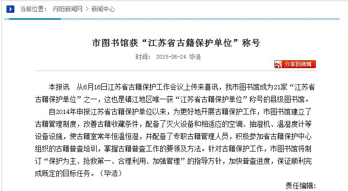 文广新局对外宣传-市图书馆获“江苏省古籍保护单位”称号