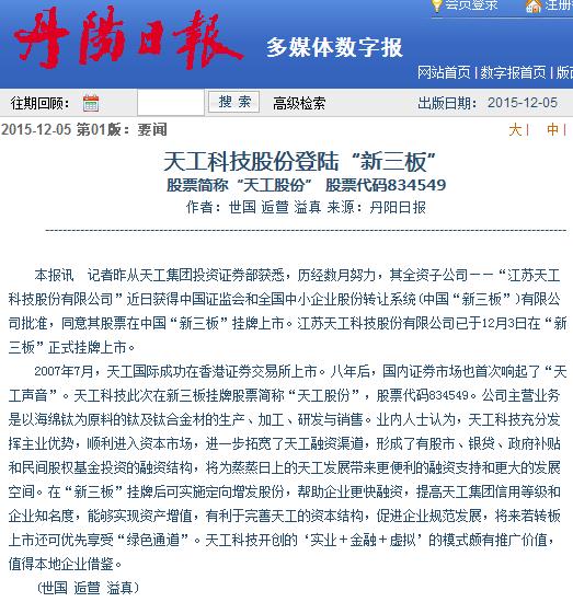 天工科技股份登陆“新三板”(丹北)
