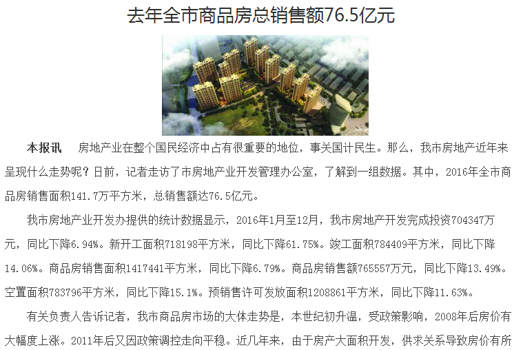 去年全市商品房总销售额76.5亿元