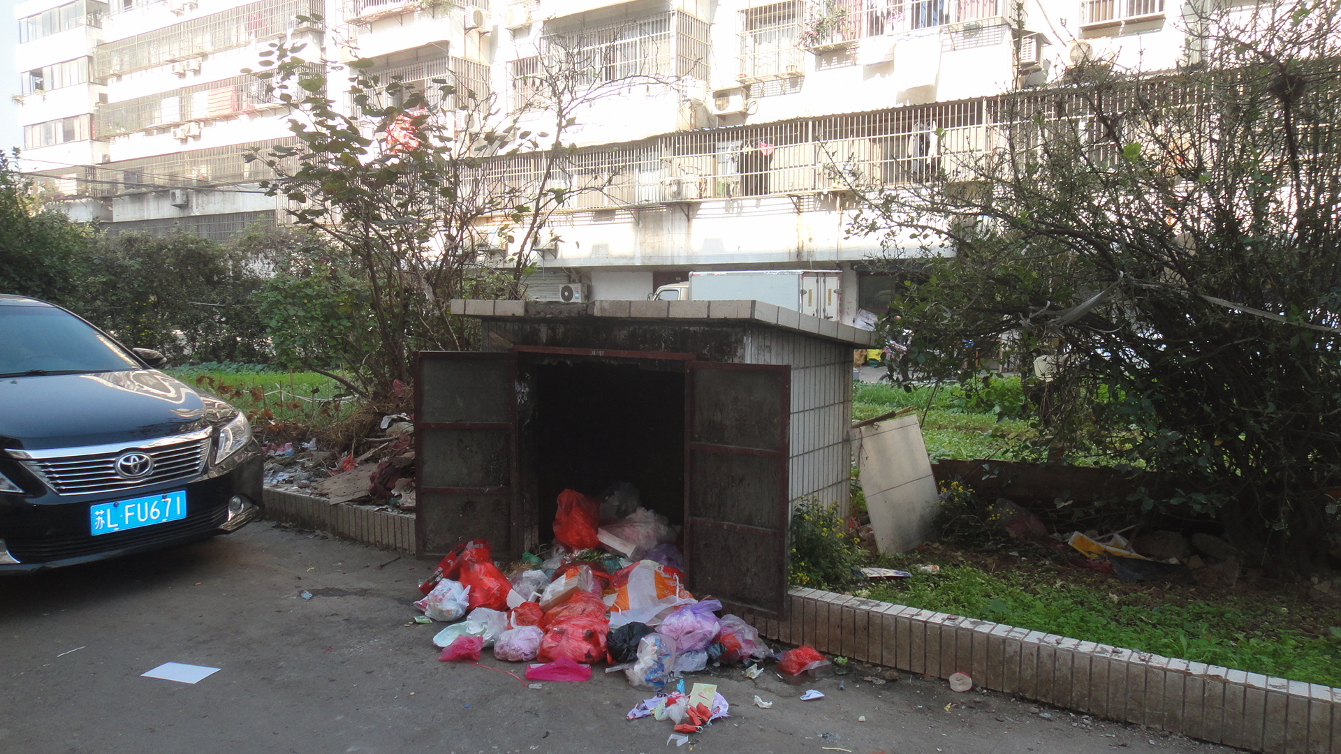 8、 大桥东苑绿化带中杂物较多,垃圾房门不关,垃圾房外有生活垃圾。