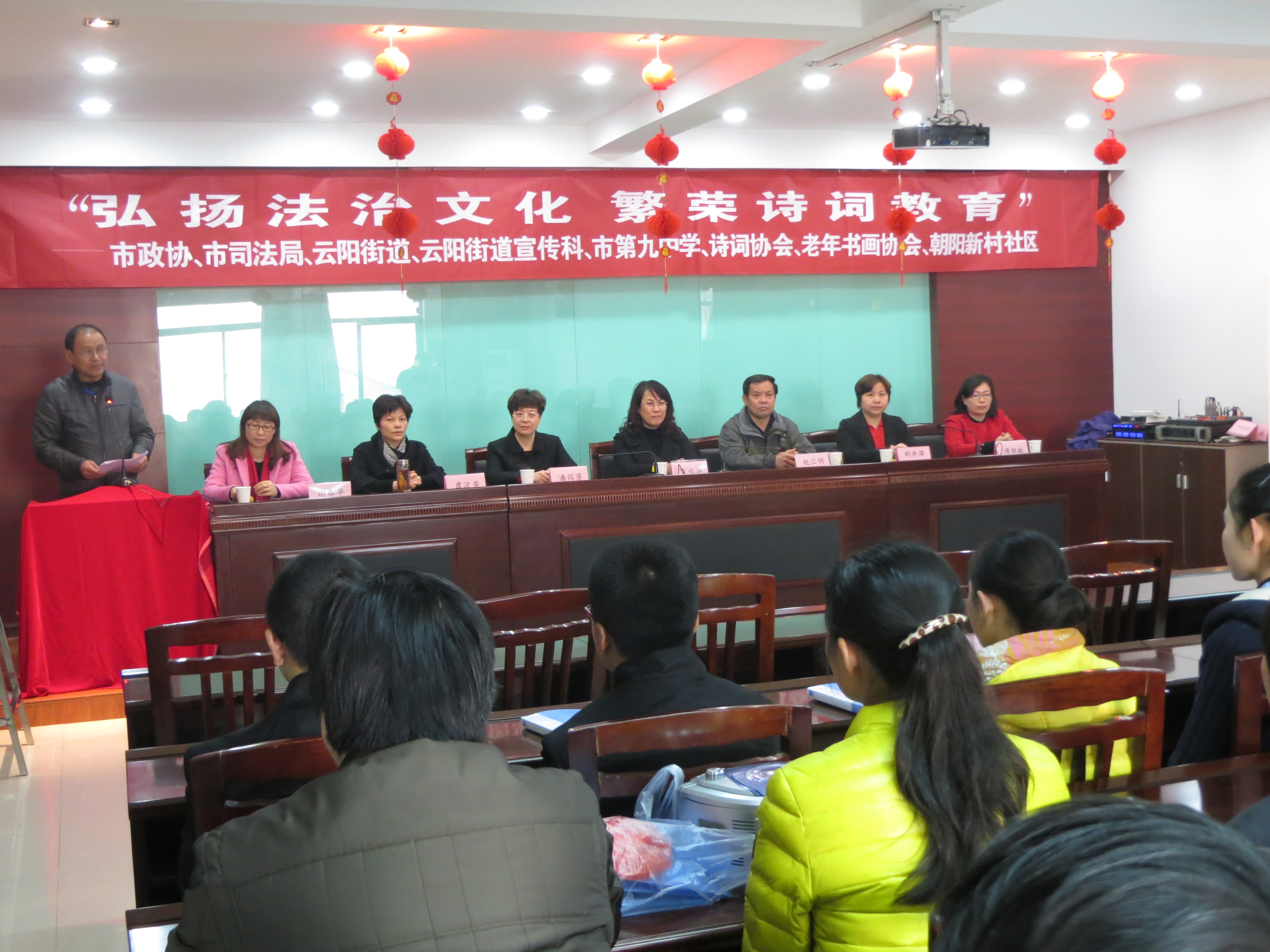 为着力培育法治文化环境,进一步推进平安社区建设,在上级领导的指导下,朝阳新村社区利用传统诗词这种喜闻乐见的文艺样式,和结对单位市政协、市司法局、云阳街道、市第九中学共同开展“弘扬法治文化 繁荣诗词教育”的活动,并借此机会成立“朝阳诗社”。