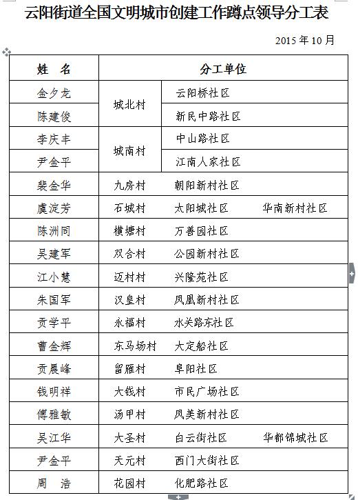 党政领导对接全国文明城市创建工作分工表
